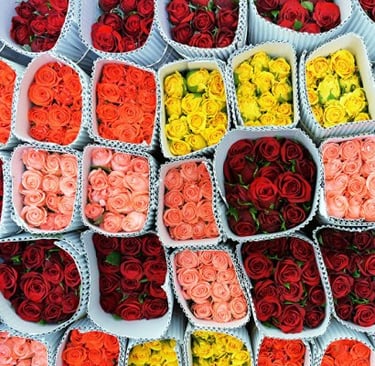 Nous offrons des fleurs coupées fraîches (notamment roses premium d’Équateur/Colombie selon arrivages), des variétés saisonnières (pivoines, renoncules, dahlias, tulipes, etc.) et des feuillages. Longueurs courantes (p. ex. 40–70 cm pour les roses) et bottes de 25 tiges selon les standards du marché